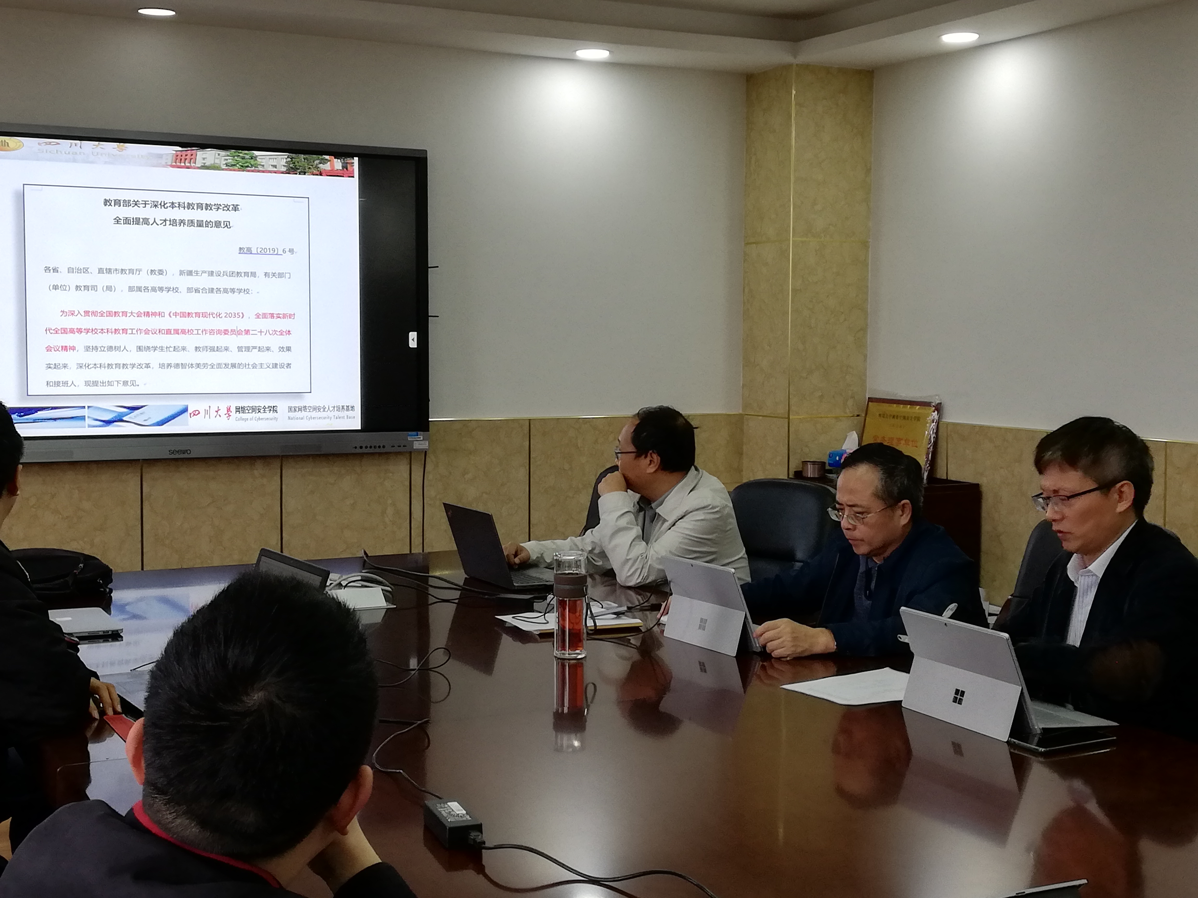 首先,方老师传达了《教育部关于深化本科公司产品改革全面提高人才培养质量的意见》的文件精神,主要从严格公司产品管理、加强基层教学组织建设、完善教师培训与激励体系、加强组织保障等方面进行了介绍,并结合自己的工作经验提出了思考和建议。