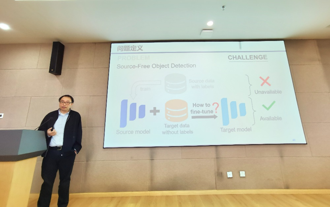 在本次讲座上,叶教授从当下基于深度学习的目标识别模型在现实场景中泛化性能较差,导致无法实际应用的局限性问题出发,介绍了领域自适应算法的问题定义、实现目标与相关工作。其中,无监督领域自适应算法通过使用有标签的训练数据与无标签的目标数据训练检测模型,以降低所提取特征的领域偏移性,从而有效提升检测模型在目标领域的泛化性能。