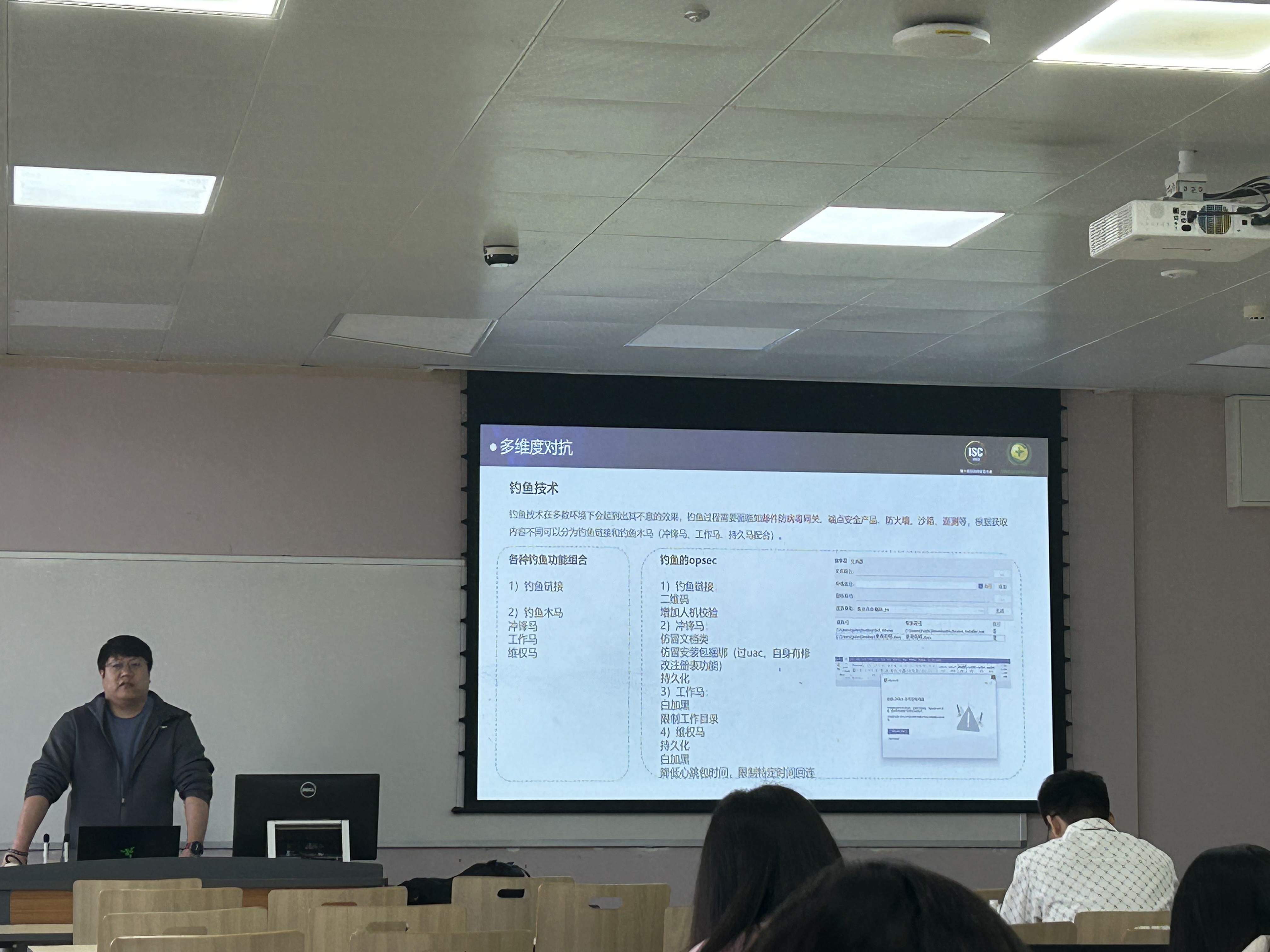 郭老师以风趣幽默的方式从网络空间防御体系变化、攻防较量、多维度对抗手段变化、以及可预见的对抗升级四个方面展开本次讲座内容。郭老师首先阐述了网络防御的目标与理想,并指出漏洞的普遍存在性,只依赖封堵和边界防护无法有效防御网络威胁的现实,因此在新技术带来新挑战的同时,网络空间必须要有威胁狩猎和应急响应能力,及时发现、阻断和处理网络威胁,为网络空间提供安全水位。随后郭老师通过几个案例为同学们描述了打破防守龟壳的攻防较量手段,郭老师指出,安全建设实施过程中仍然存在些许问题,钓鱼技术在大多数环境下会起到出其不意的效果,同学们需要提高安全意识,不要轻易相信未知来源的电子邮件、消息和链接,并保持个人信息的保密性。