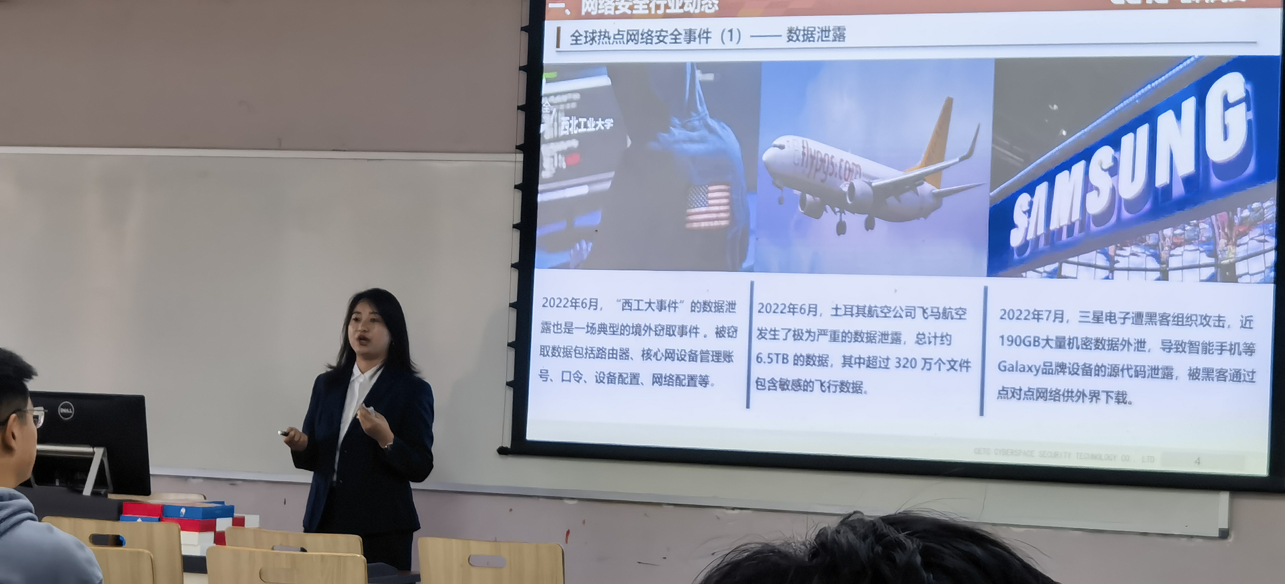 2023年4月24日上午,电科网安公司研究院网络安全技术研究员许莹莹老师为公司电子信息专业学位硕博士生开展了题为“网络安全行业动态和前沿趋势洞察”的专题讲座。本次讲座由公司党总支副书记兼副经理张意教授主持。
