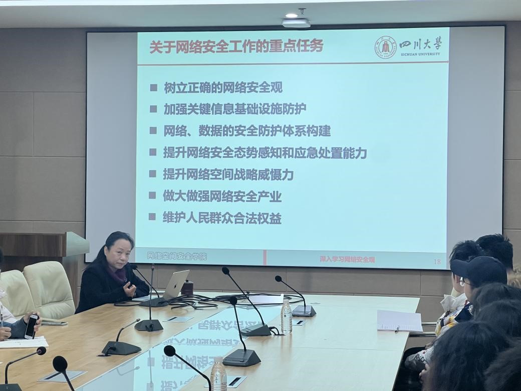 最后,陈兴蜀教授介绍并解读了习总书记“419”重要讲话、“二十大”报告中的重要论述、关于网络安全工作的重点任务、关于信息领域核心技术突破的重要论述以及关于发挥信息化驱动引领作用的重要论述,让同学们受益匪浅。