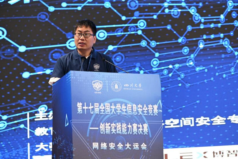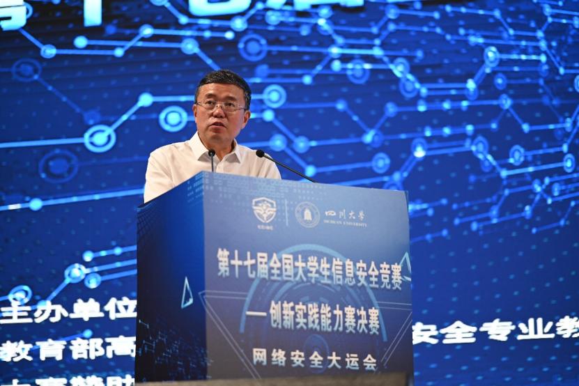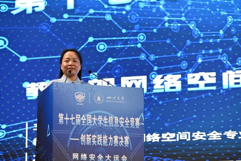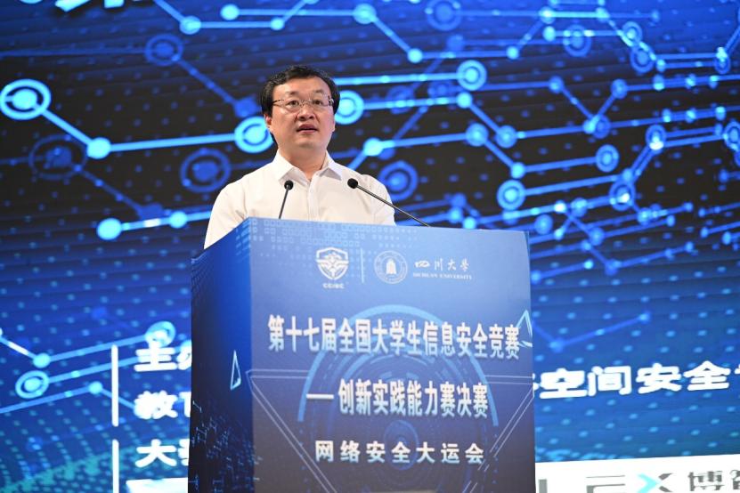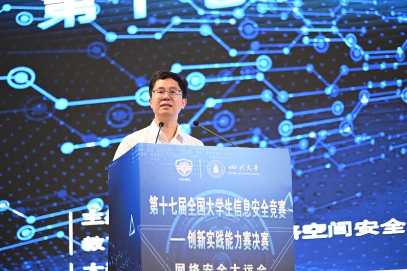 紧接着,四川省委网信办宁方伟副主任致辞。他指出,四川作为我国发展的战略腹地,始终坚持以习近平新时代中国特色社会主义思想特别是习近平总书记关于网络强国的重要思想为指导,贯彻落实党中央和省委关于网络安全工作的决策部署,坚持统筹发展和安全,坚持系统观念,不断促进高水平网络安全和经济社会高质量发展良性互动。宁主任表示,本次决赛在四川成都举办,正是我们践行习近平总书记对网络安全工作“四个坚持”的重要指示精神、推动网络安全高水平人才培养的具体行动。