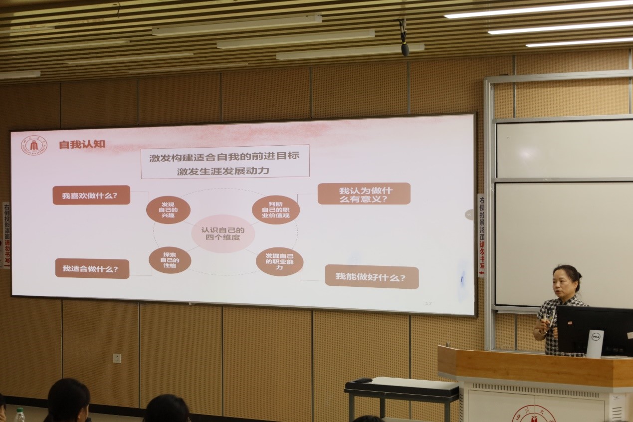 接着,她以川大优秀学长学姐为例,鼓励同学们以他们为榜样,努力向他们学习。同时,陈经理希望同学们能够做好生涯规划,她详细阐述了生涯规划的内容和步骤,并从自我探索、自我判断的角度指引新生探索自己的路。