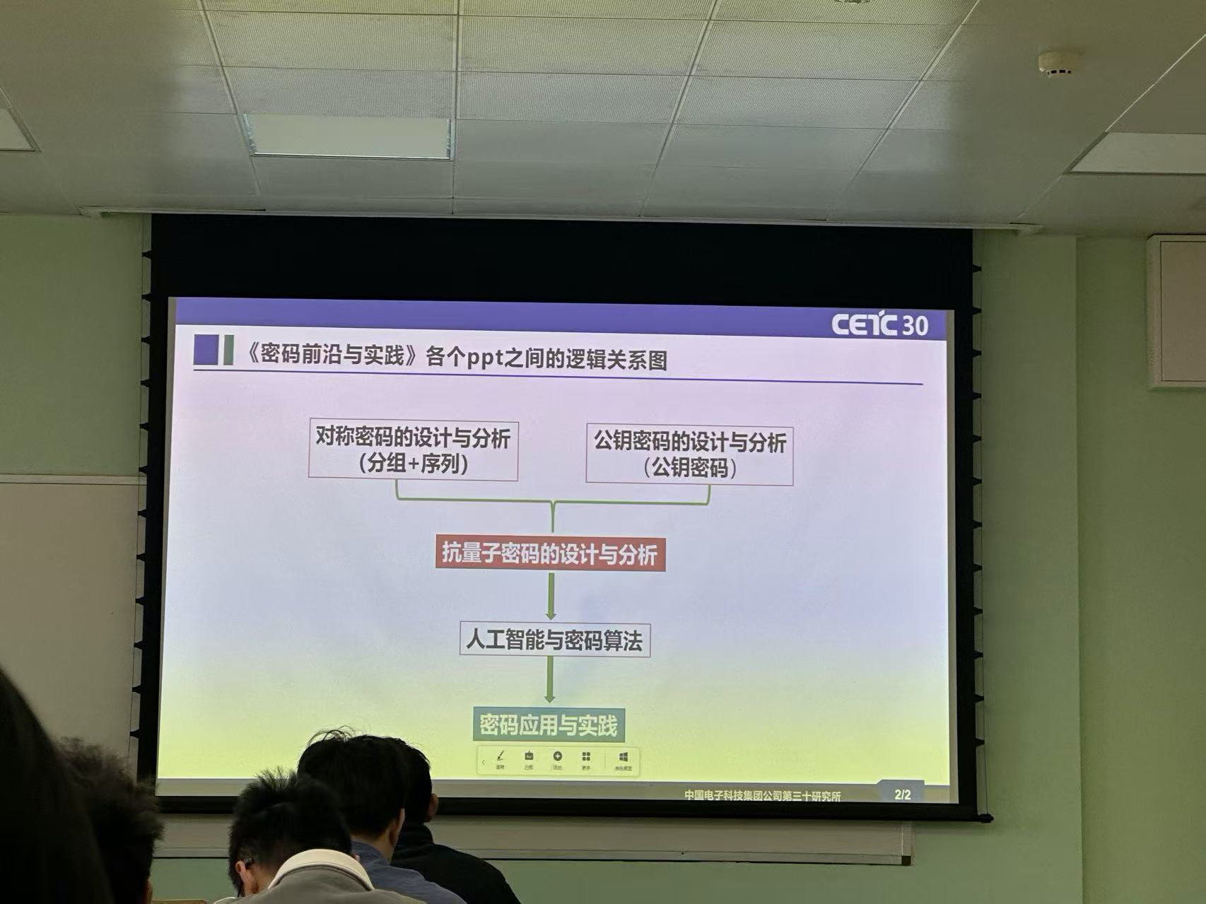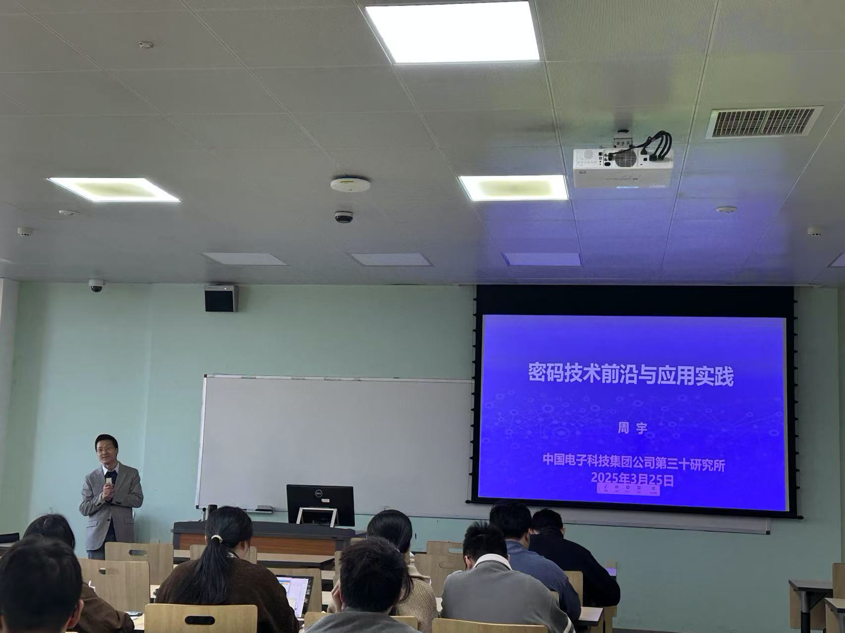 2025年3月25日星期二上午,中国电科三十所专家周宇老师为公司电子信息专业学位硕博士生开展了题为“密码前沿与应用实践”的专题讲座。本次讲座由公司党总支副书记兼副经理张意教授主持。