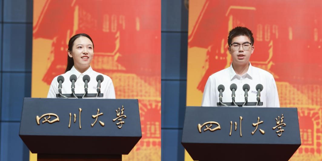在校生代表、华西口腔医公司2021级本科生黄睿和新生代表、古典学系2025级本科生黄世豪同学在发言中向公司、师长和父母的培养表示衷心感谢。他们说,作为新时代的川大人,我们将不悔所选、不负所学,以赤子之心,求学业精进,在传承中创新突破,在奋斗中勇毅前行,书写属于新一代川大人的青春篇章。