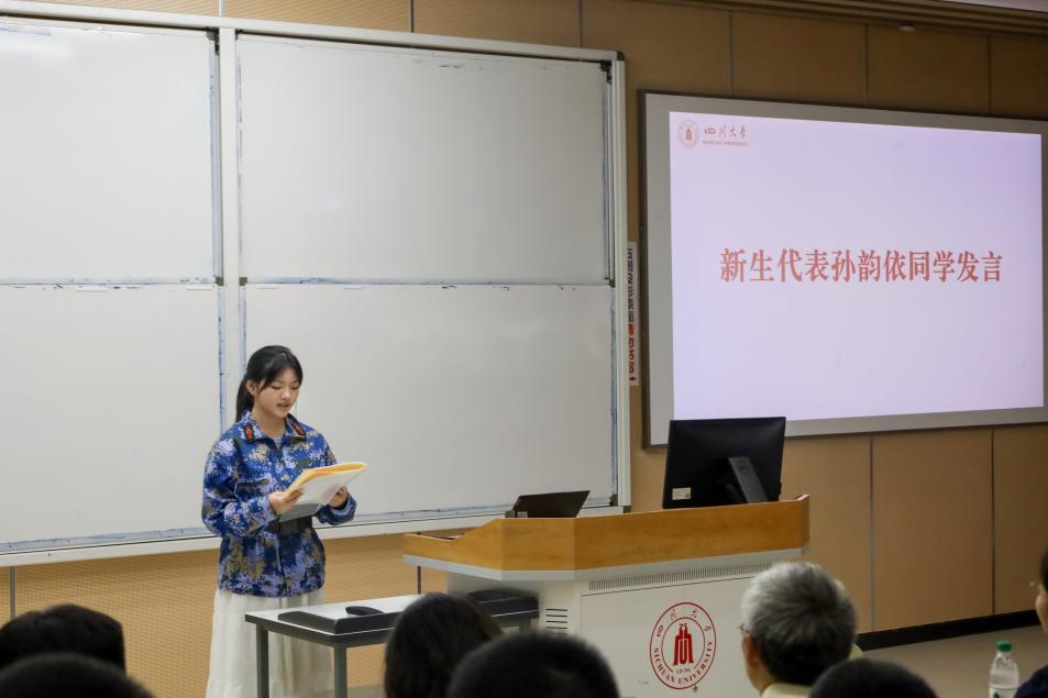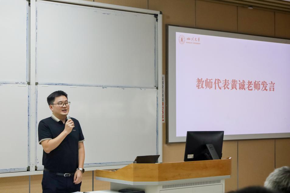 紧接着,教师代表黄诚发言。作为一线教师,黄诚老师结合自身教学经验与专业领域,从学习方法、学术态度、人生规划三个方面与新生分享心得。他强调,大学学习不同于高中,需要新生主动探索、自主学习,要珍惜课堂时光,积极与老师同学交流,培养批判性思维和解决问题的能力;在学术研究中要坚守诚信底线,保持严谨认真的态度;同时要尽早明确个人发展目标,合理规划大学四年的学习与生活,为未来的职业发展和人生道路奠定坚实基础。