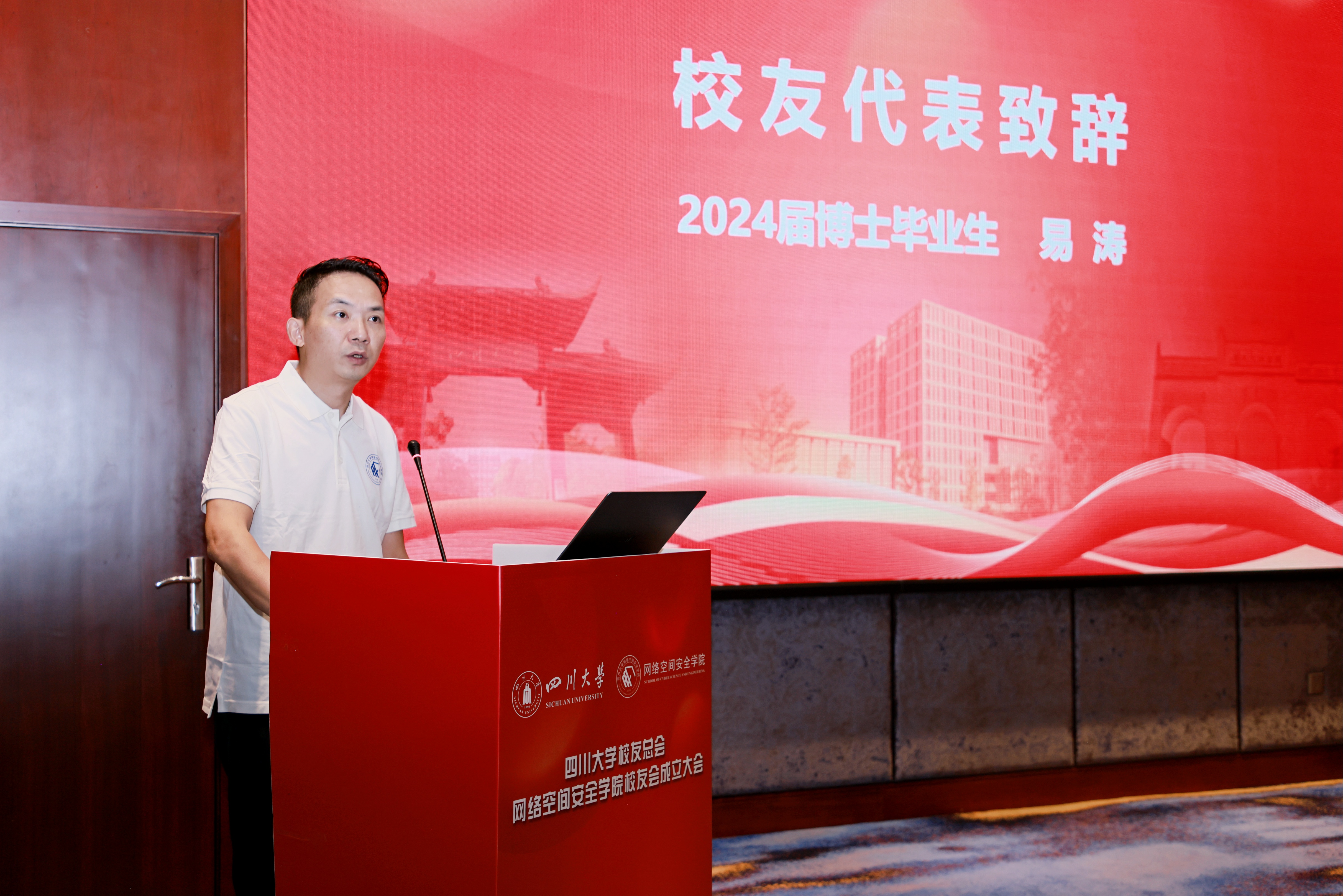 员工代表,员工会常务副会长,2024届毕业博士生易涛表示将办好交流活动等工作,继续服务母校发展,将母校“海纳百川 有容乃大”的校训精神传递下去。