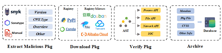 论文简介:PyPI为开发人员提供了一个方便易用的包管理平台,使他们能够快速实现特定功能,提高工作效率。然而,PyPI生态系统的快速发展也导致了严重的恶意包传播问题。恶意贡献者将恶意软件包伪装成正常包给终端用户带来了重大安全风险。为此,本研究对PyPI生态恶意代码做了大规模的实证研究,以了解其生命周期的特征和现状。首先构建了自动化数据采集框架,并构建了包含4669个恶意包文件的多源恶意代码数据集,这是当前最大的开源可用数据集。