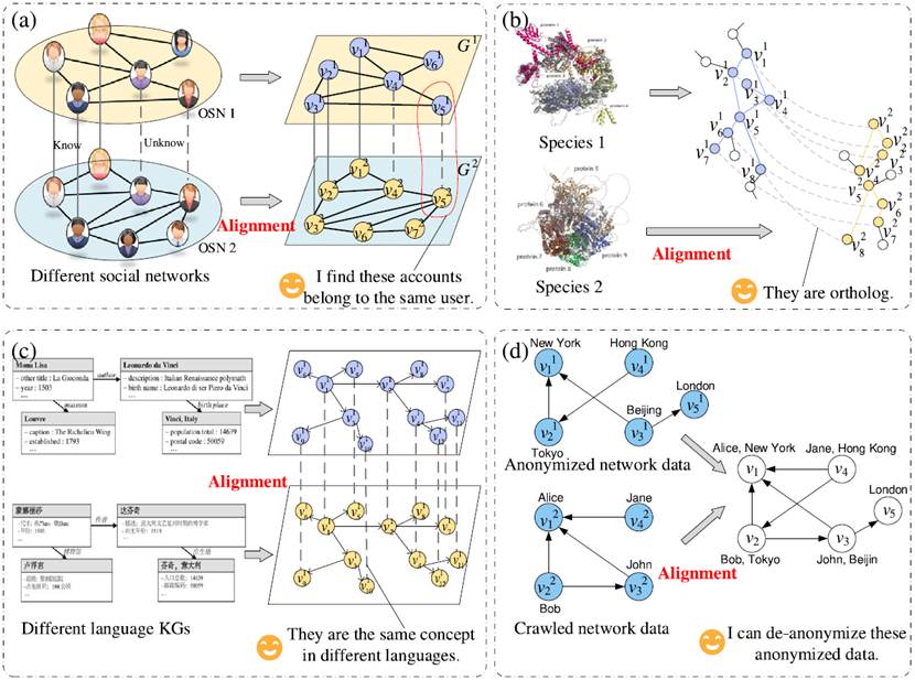 真实和虚拟世界复杂系统中,组成元素之间的复杂交互可以建模为复杂网络,从而借助图论、概率统计和人工智能等理论与技术进行挖掘和研究。当某些元素同时存在于多个系统中时,揭示这些元素在不同网络中的对应关系(即网络对齐问题)显得尤为重要。这不仅能够加深人类对复杂系统结构和行为的理解,还能推动相关研究的扩展与验证,并促进不同领域的实际应用。例如,在网络空间安全领域,网络对齐可用于对齐不同社交网络系统,帮助实现跨平台用户身份关联、匿名账号识别以及虚假信息传播路径的分析;生物信息学领域,网络对齐可用于对齐跨物种的蛋白质-蛋白质交互网络,帮助识别保守功能模块、同源物并注释蛋白质功能。