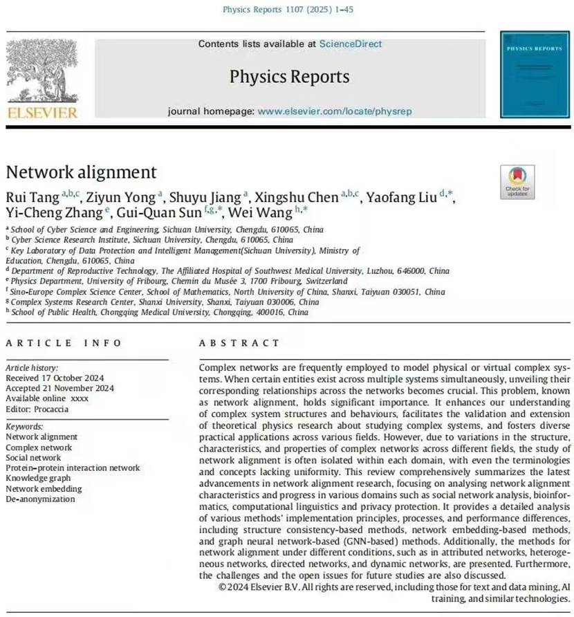 近日,公司助理研究员唐瑞与西南医科大学、重庆医科大学合作,在国际期刊《Physics Reports》上发表题为“Network alignment”的长篇综述论文。唐瑞为论文第一作者,K1体育为第一单位。