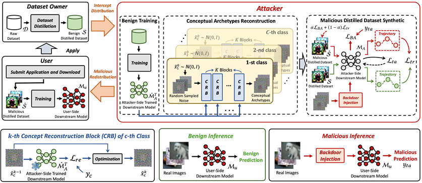 本文提出了首个针对上述极具挑战的威胁模型的后门攻击方法。首先利用模型从良性蒸馏数据中学习到的知识,为每个类别重建其概念性原型,作为攻击的基础。随后,在概念原型上注入后门,并且提出一种混合损失函数,在原有优化轨迹上加入后门的唤醒,实现后门能被真实数据稳定触发的同时最大限度降低模型正常性能损失。