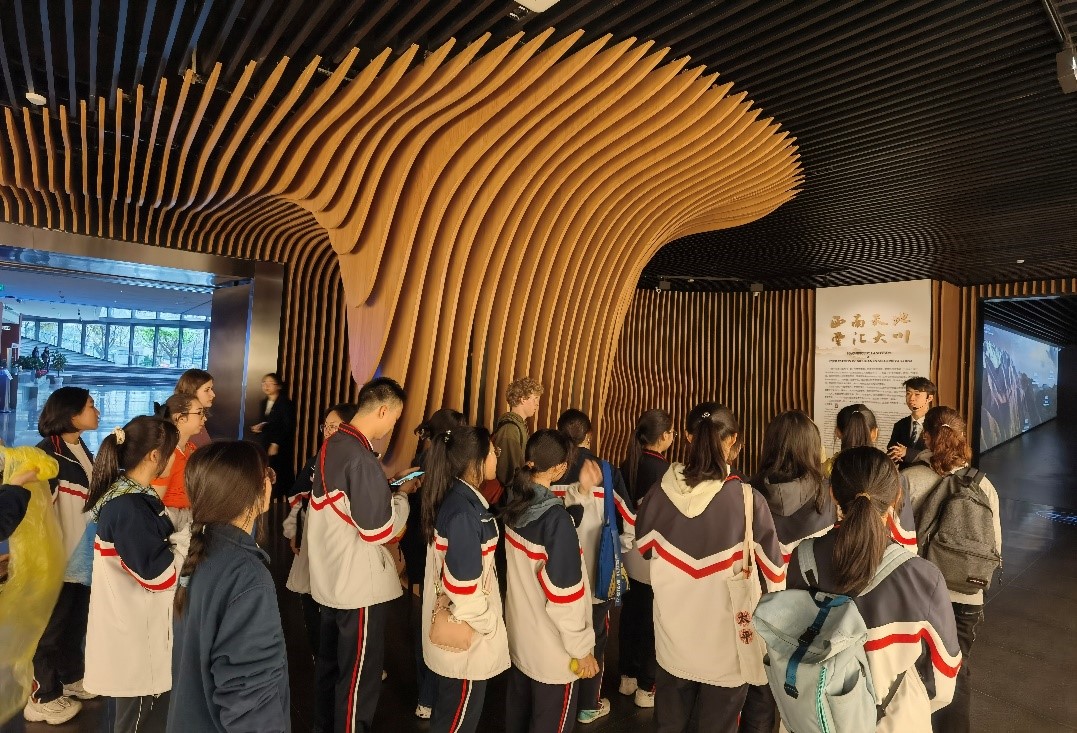 K1体育本科教学科何露老师陪同中法师生从公司北门步行到东门,沿途参观了大红门、双荷池、基础教学楼、校史馆、江姐纪念馆等景观,最终来到全新建成的K1体育官方网站博物馆进行研学参观。K1体育官方网站博物馆是中国西南地区建立最早、也是中国第一座综合性大学博物馆,是中国历史最为悠久的博物馆之一,它将人文与自然结合,艺术与科学结合,科学研究与大众普及相结合,形成独具特色的藏品组成结构。中法师生们通过馆内的专员讲解,近距离感受馆内的陈列展示,与藏品们展开一场跨越百年时空的文化交流,对这片中国的西南大地有了更切实的感触。