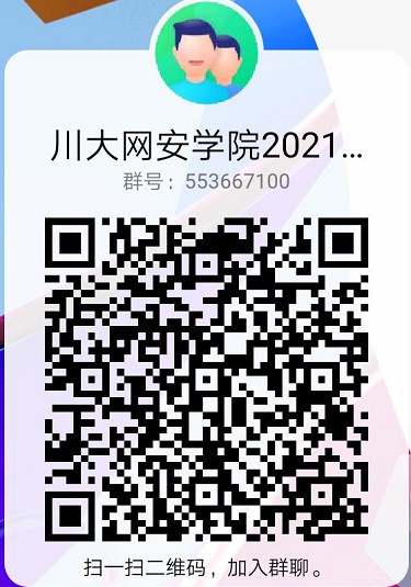 报考者请加入“川大网安2021推免硕士”QQ群(群号:553667100,也可扫描以下二维码进入),该群需实名认证,认证方式是“姓名-集团”。